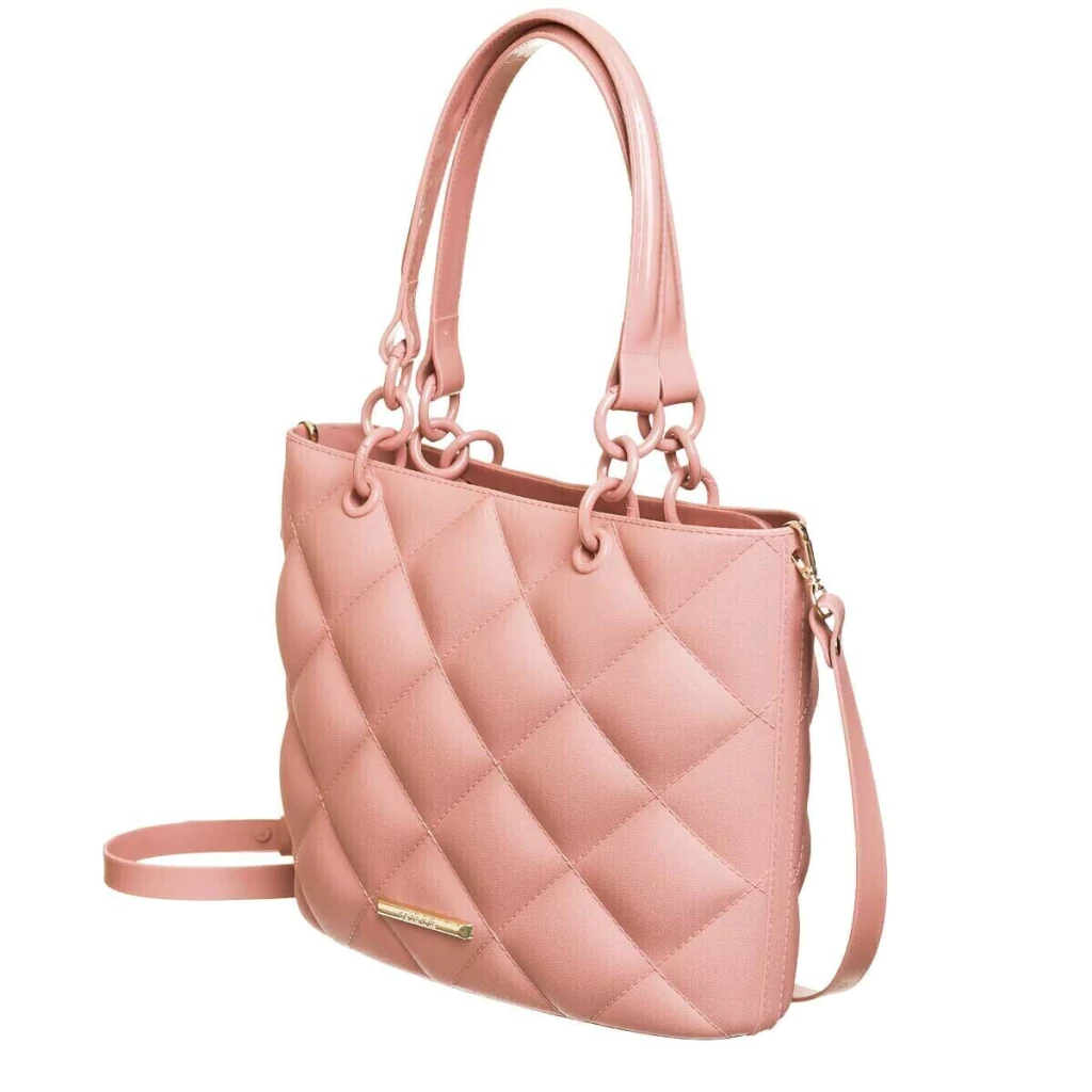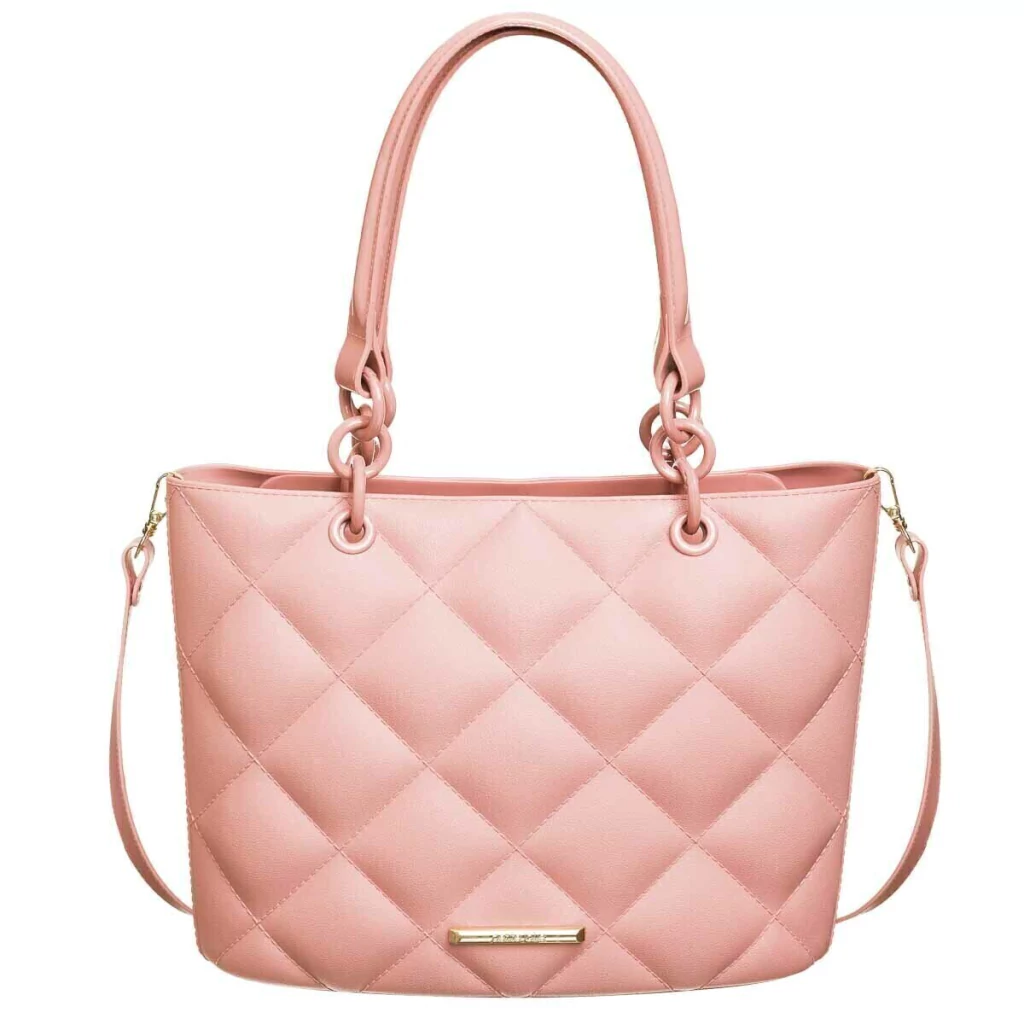 Cartera de hombro en tono rosa suave con diseño matelassé, ideal para sumar un toque femenino y sofisticado a cualquier look. Su acabado acolchado y la placa metálica con el logo frontal aportan distinción, mientras que las asas dobles con eslabones y la correa desmontable ofrecen versatilidad para usarla tanto al hombro como cruzada. Amplia y funcional, es perfecta para acompañarte durante el día o la noche.
