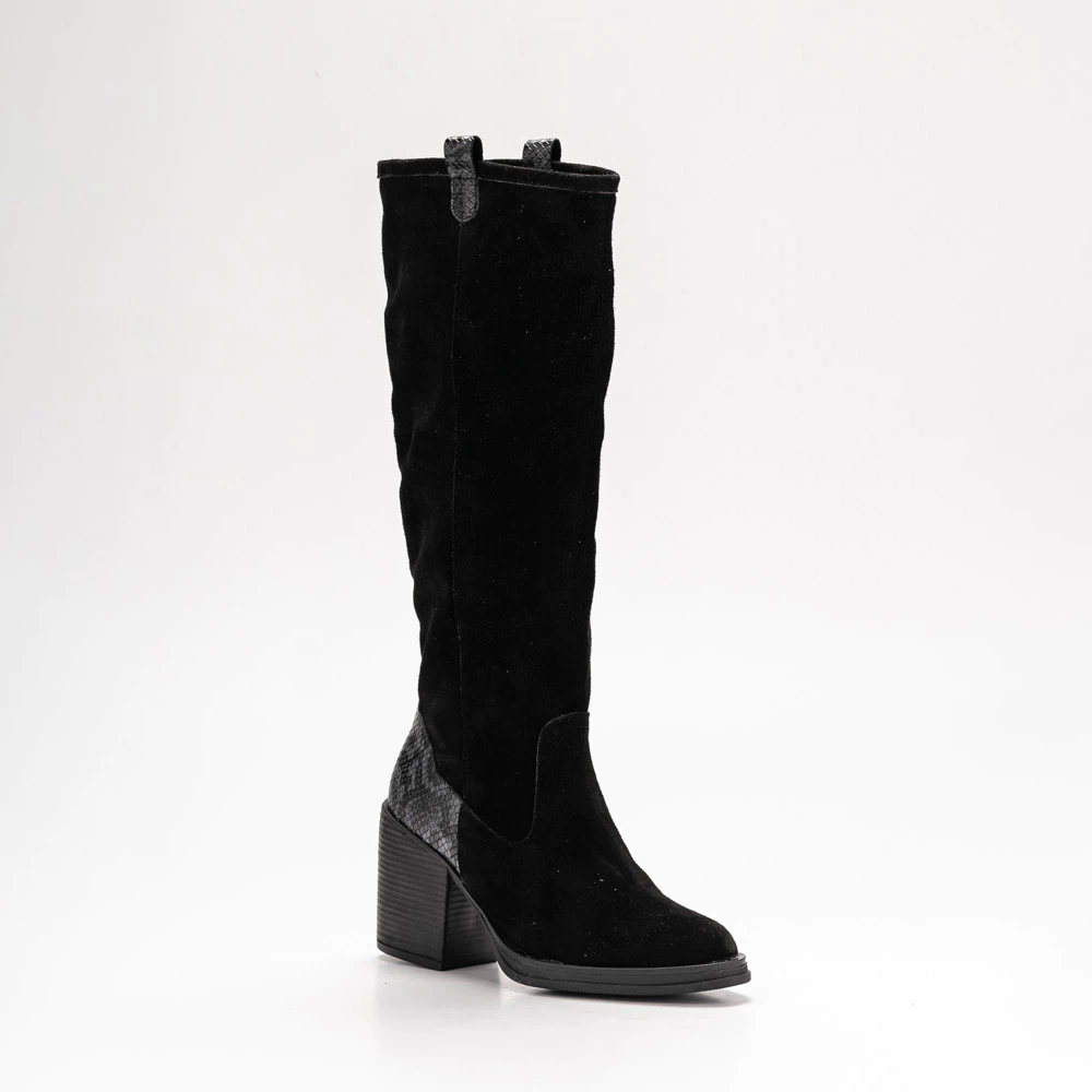 Diseño que impone y estiliza. Esta bota alta de gamuza negra es sinónimo de elegancia con actitud. Con taco ancho y caña recta, es ideal para marcar presencia en cada paso, tanto de día como de noche.