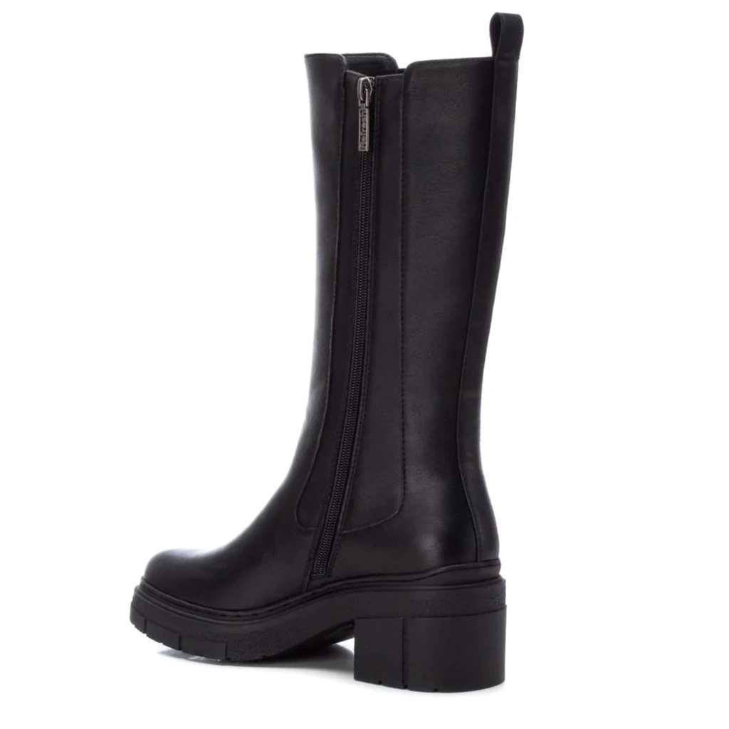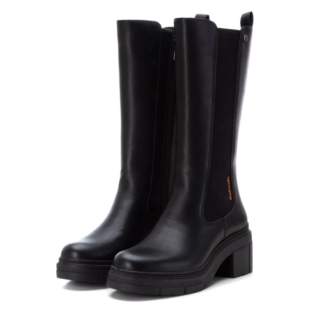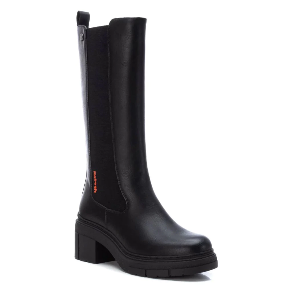 Bota de mujer, de la marca Refresh. Fabricada en material que imita la piel. Cierre lateral. Modelo tipo chelsea con elástico lateral y tirador trasero para facilitar la puesta. Tacón ancho de 6 cm con suela de goma antideslizante. Este modelo ha obtenido el certificado vegano por la organización mundial PETA (Organización de los derechos de los animales).