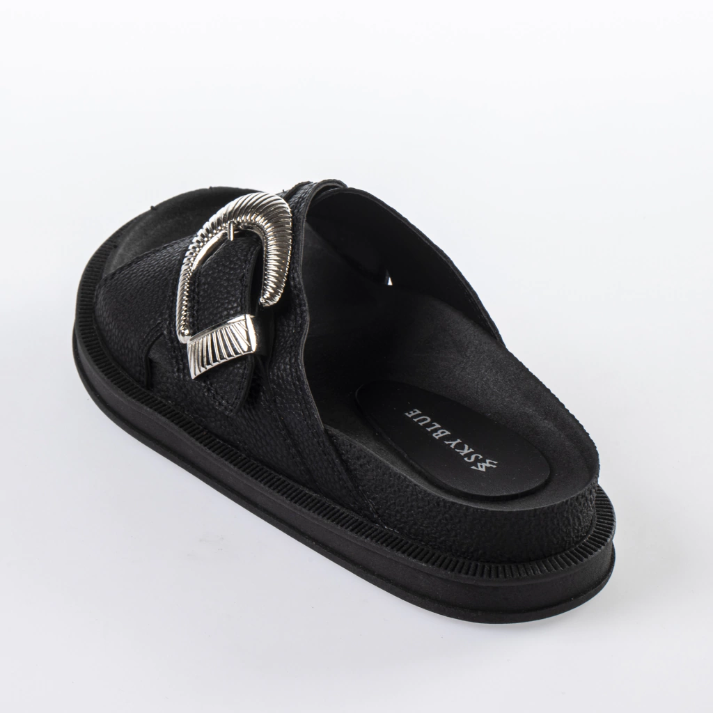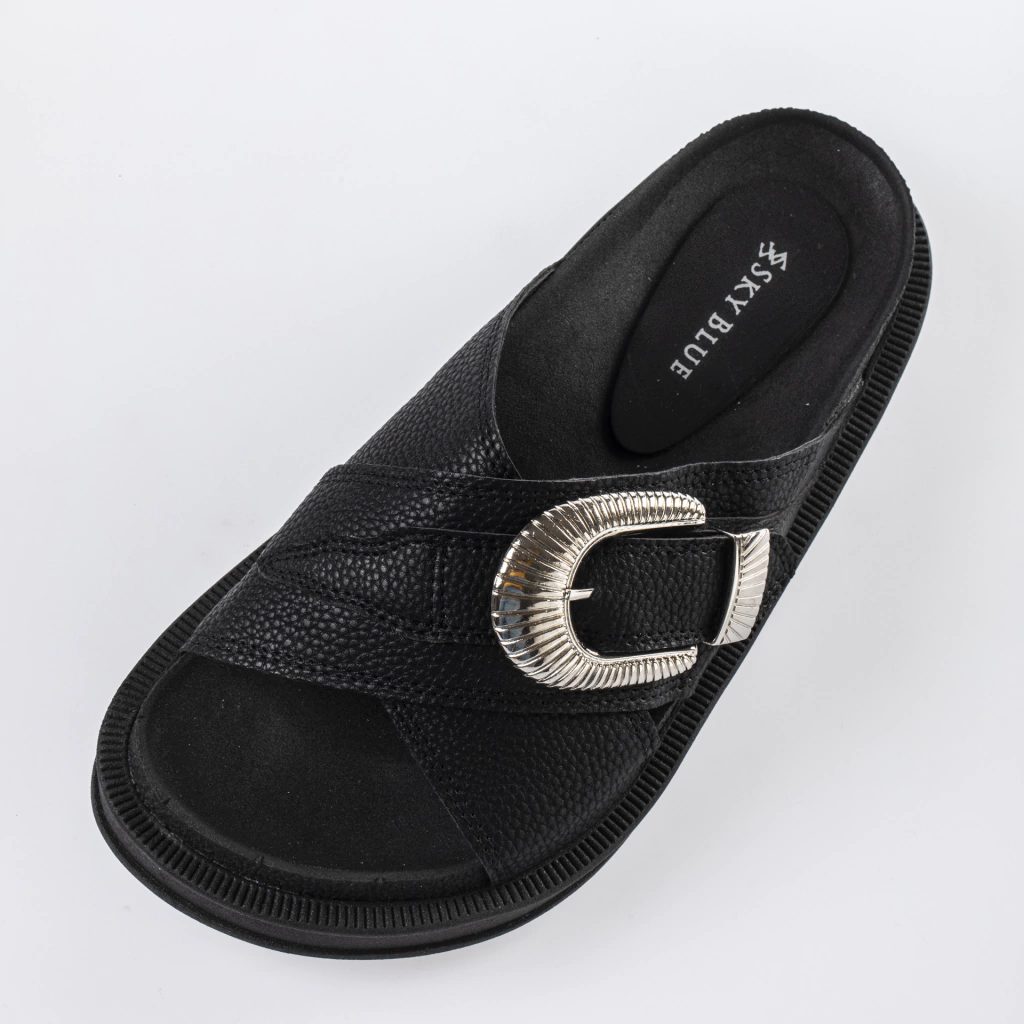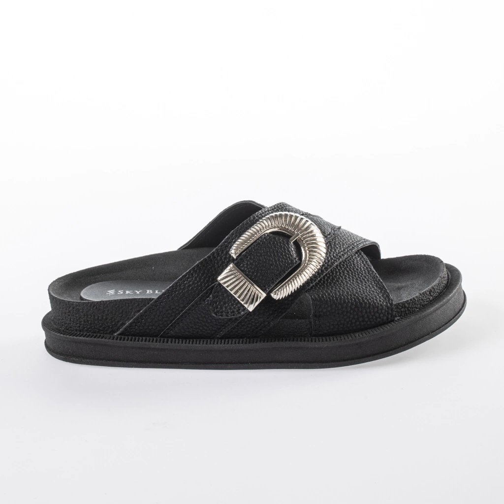 Sandalias elaboradas en cuero sintético, con dos tiras cruzadas y hebilla.