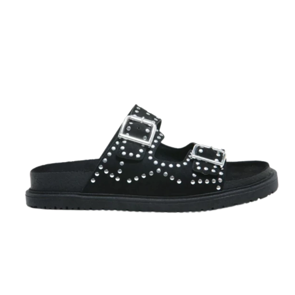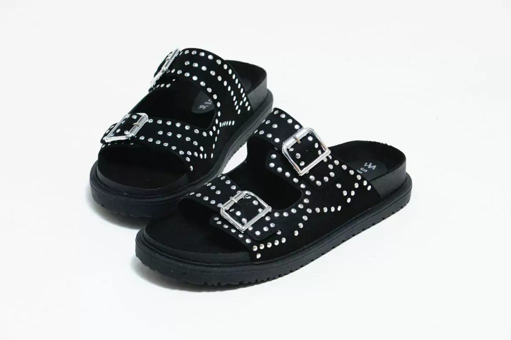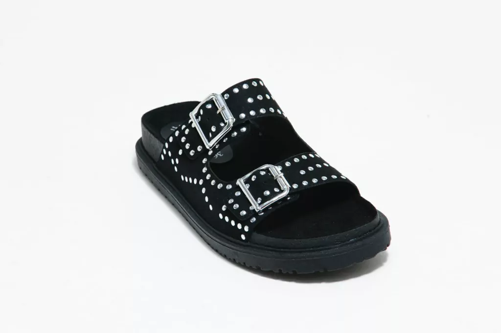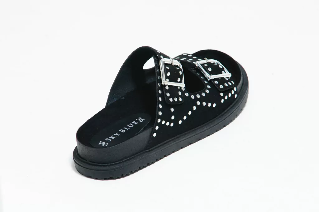Sandalias realizdas en napa PU, tiras con detalle de hebillas metalicas y remaches, plantilla termoformada y suela de eva