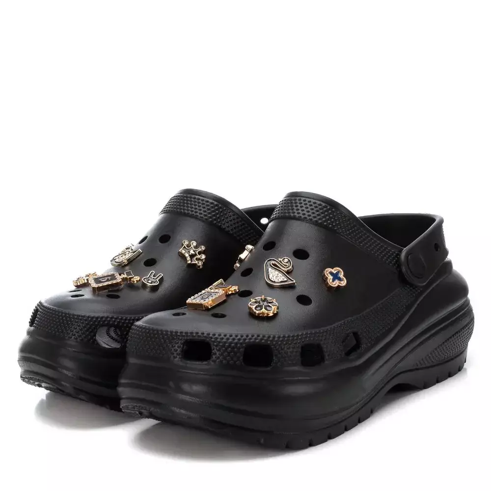 Añade un toque divertido y moderno a tu look con estos zuecos en color negro de XTI.  Con charms que les aportan un estilo único y personal, son ideales para tus días de verano. Cómodos, frescos y llenos de personalidad, ¡no pueden faltar en tu armario!
